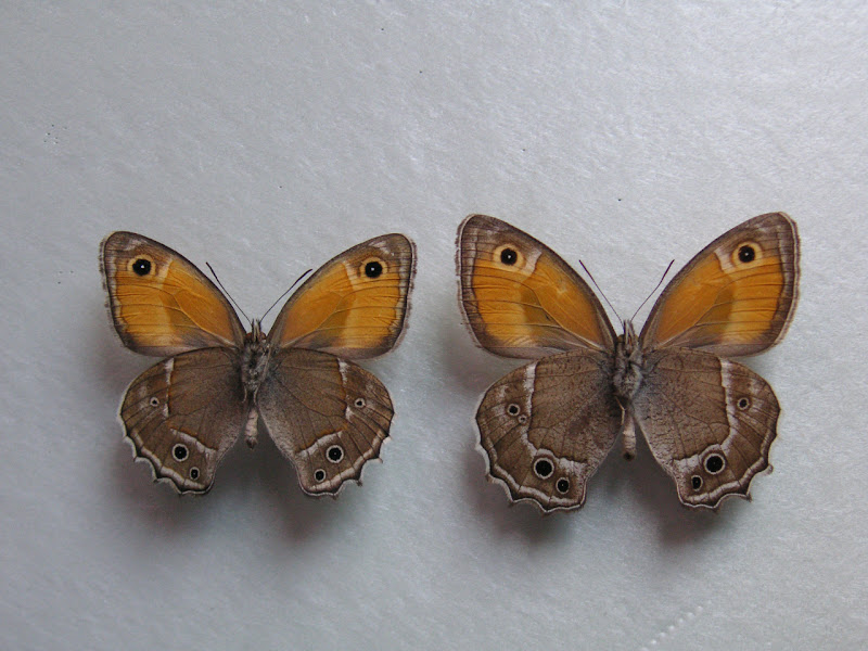 À gauche : Hyponephele davendra seravschanica LUKHTANOV, V. A., 1997 (recto). 35 km au nord de Dushanbe (Tadjikistan), 1505 m, 5.VII.2009. À droite : Hyponephele latistigma MOORE, 1893. B?yer Ahmad K?h-e Din?r env. Sisaht, 3000 m (Iran). 5.VII.2001. Photo : J.-F. Charmeux