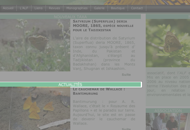 • Annonces : propositions (filtrées, mais non testées) de voyages, de matériels entomologiques, etc., adressées au site lepido-france.