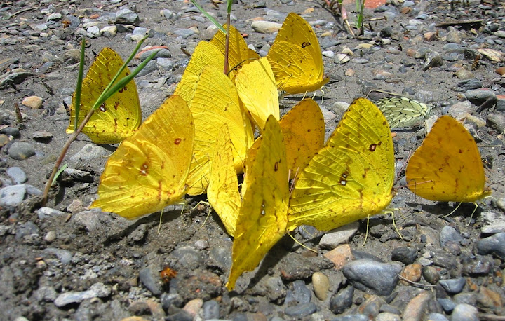 Divers Pieridae : Phoebis philea, Aphrissa statira, Anteos menippe et (premier plan) Ganyra phaloe (?). Deux Papilionidae dont Eurytides serville. Rio Broncini (alt. : 600 m), à l’ouest de Caranavi (Bolivie), 18 janvier 2004. Photo : H. Bloch