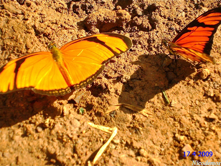À gauche : Dryas iulia (FABRICIUS, 1775). À droite : Dione juno (CRAMER, 1779). Pitangui (MG, Brésil), 17 avril 2009. Photo : Nicodemos Rosa