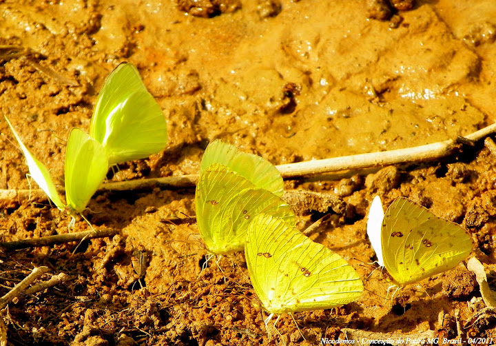 Eurema albula sinoe (GODART, 1819) en blanc, et Eurema agave pallida (CHAVANNES, 1850). Pitangui (MG, Brésil), 25 mars 2012. Photo : Nicodemos Rosa
