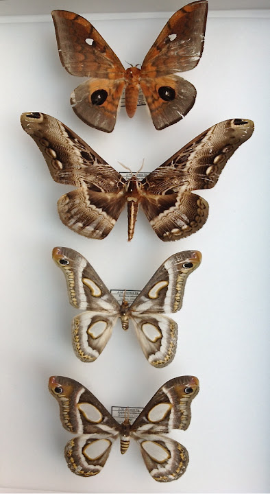 Saturniidae (de haut en bas) : Pseudobunaea cleopatra AURIVILLIUS, 1893, Epiphora mineti DARGE, 1994, Epiphora rectifascia ROTHSCHILD, 1907. Brahmaeidae : Dactyloceras lucina DRURY, 1782. Ebogo, avril 2012. Coll. et photo : J.-M. Gayman